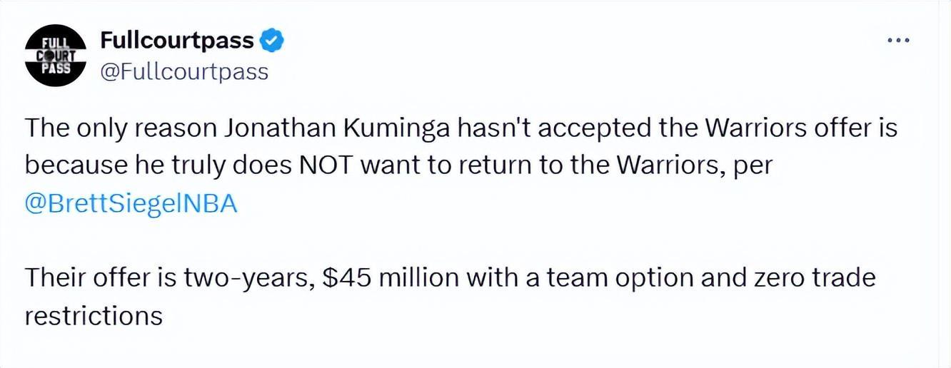 诚然,接受资质报价能让他在2026年成为完全自由球员,自主选择下家;但即便签下两年期合同,若勇士队未在合同期内交易他,且在第二年选择执行“球队选项”,库明加仍有机会在明年成为自由球员。